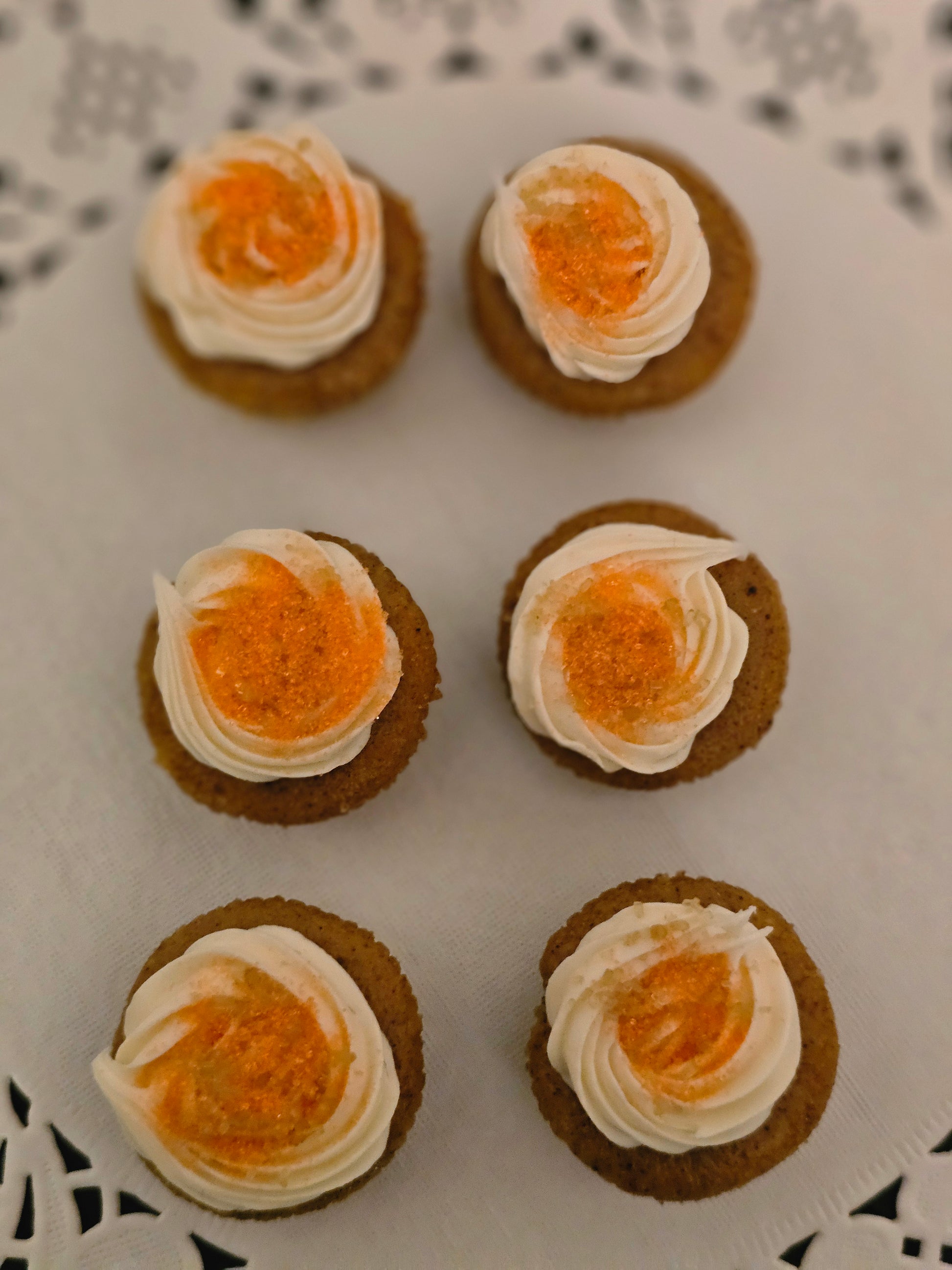 Bite-sized velvety pumpkin pound cake muffins blended with cinnamon, nutmeg, ginger, and cloves, topped with cream cheese icing and vanilla sugar.