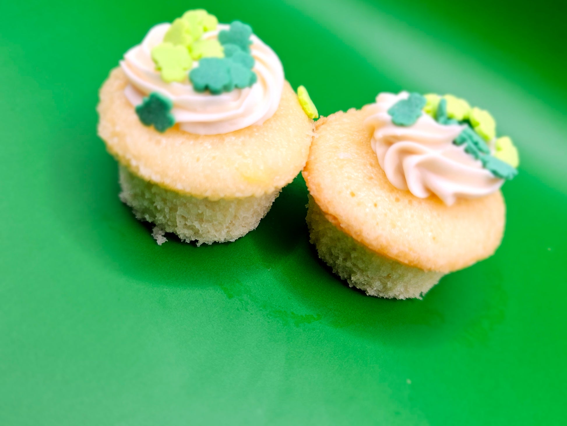 Bite-sized delicate pound cake swirled with cream cheese icing and sprinkled with clovers.