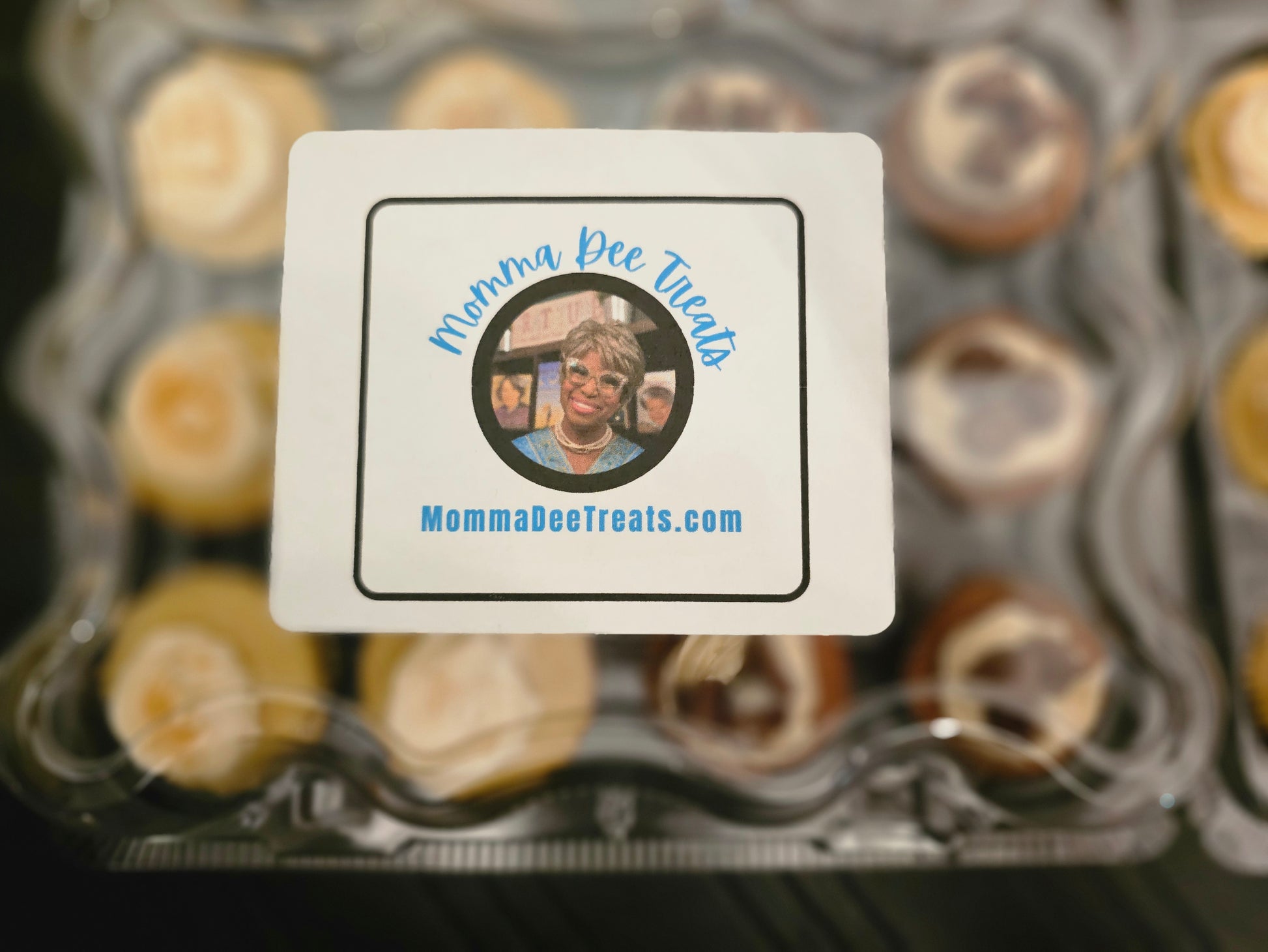 6 Bite-sized smooth vanilla pound cake muffins topped with cream cheese icing and sprinkled with vanilla sugar.